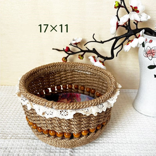 Eco-Friendly Jute Decorative Basket with Lace Trim for Home Organization