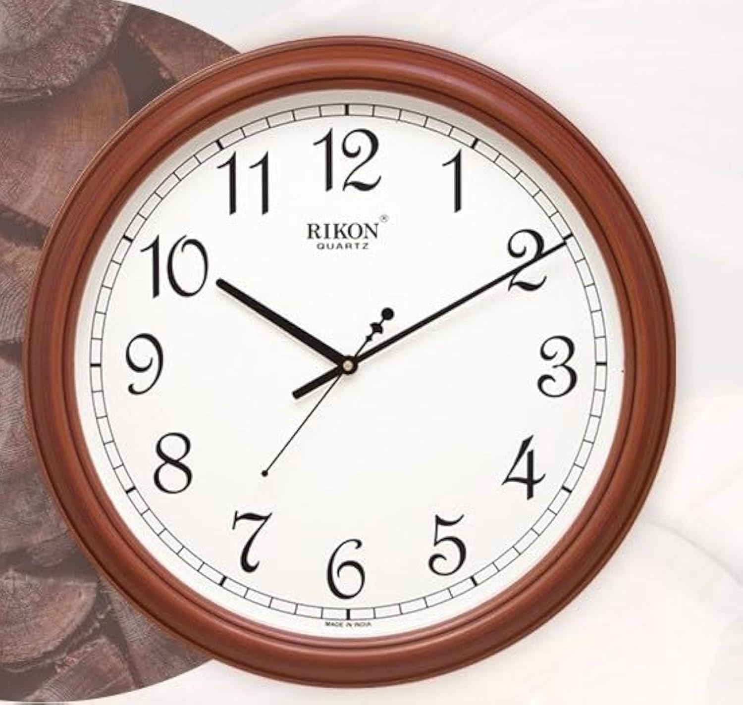 It features a wood‑finish frame and quartz movement with a white dial.